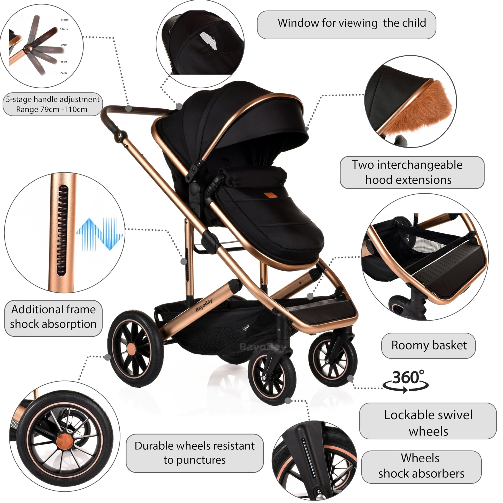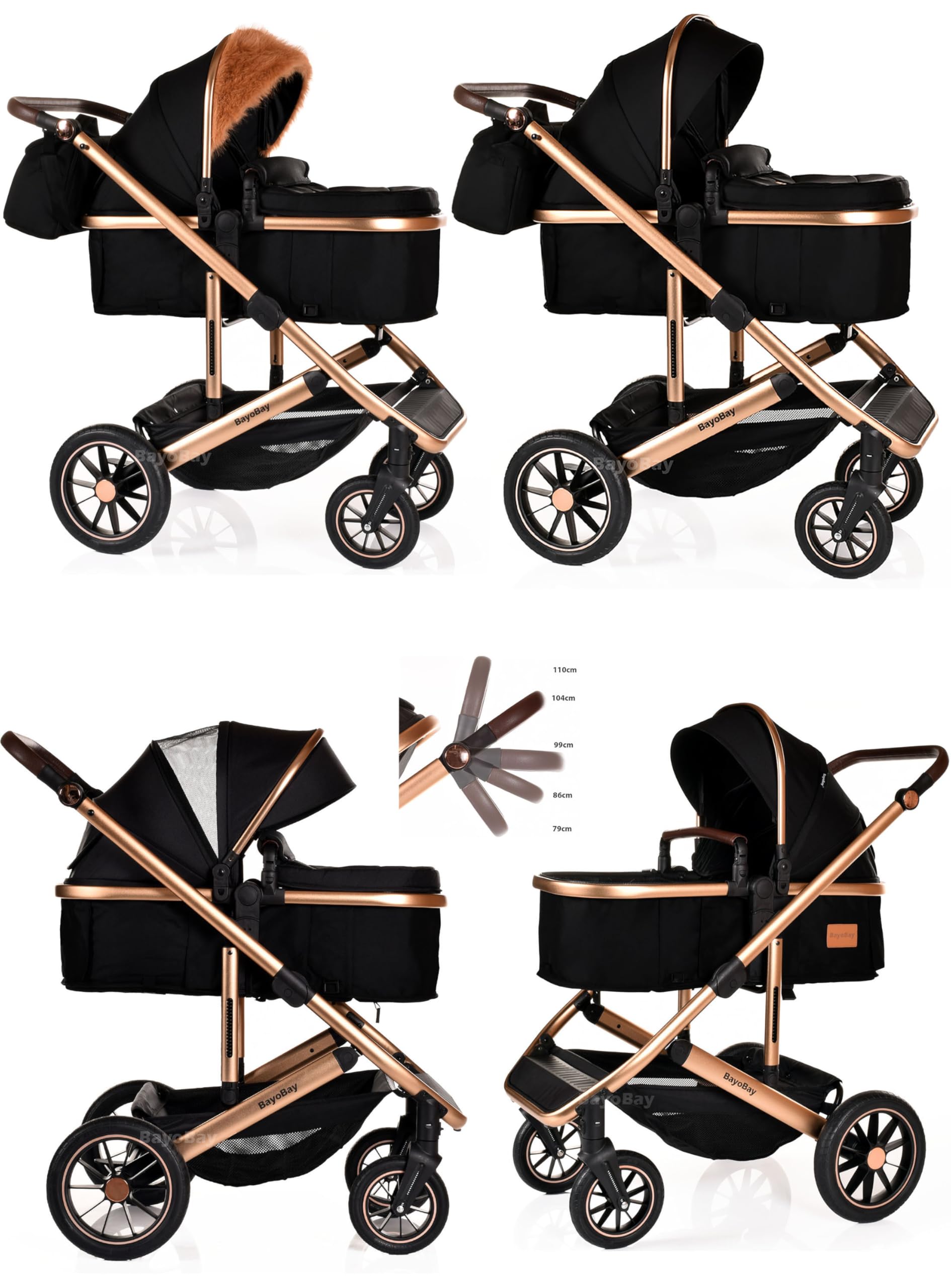- ● ✅TWO HOOD EXTENSION STYLES.PLAIN AND FUR-LINED✅FIVE-STAGE HANDLE ADJUSTMENT✅ RUBBER WHEELS (NOT EVA-plastic), puncture-proof, all-terrain ✅MOMMY BAG ✅RAIN COVER ✅ BOTTLE HOLDER ✅ADJUSTABLE ECO-LEATHER HANDLE (suitable for caregivers between 155-190 cm high) ✅WIDE ENHANCED FRAME ✅ 3D SHOCK ABSORPTION.MULTIFUNCTION STROLLER. The infant stroller can also serve as a toddler seat stroller. The sleeping bassinet can be adjusted into a seat position. Baby sits upright or semi-reclined. The convertible stroller allows a baby to face either their parents or the outdoor scene.