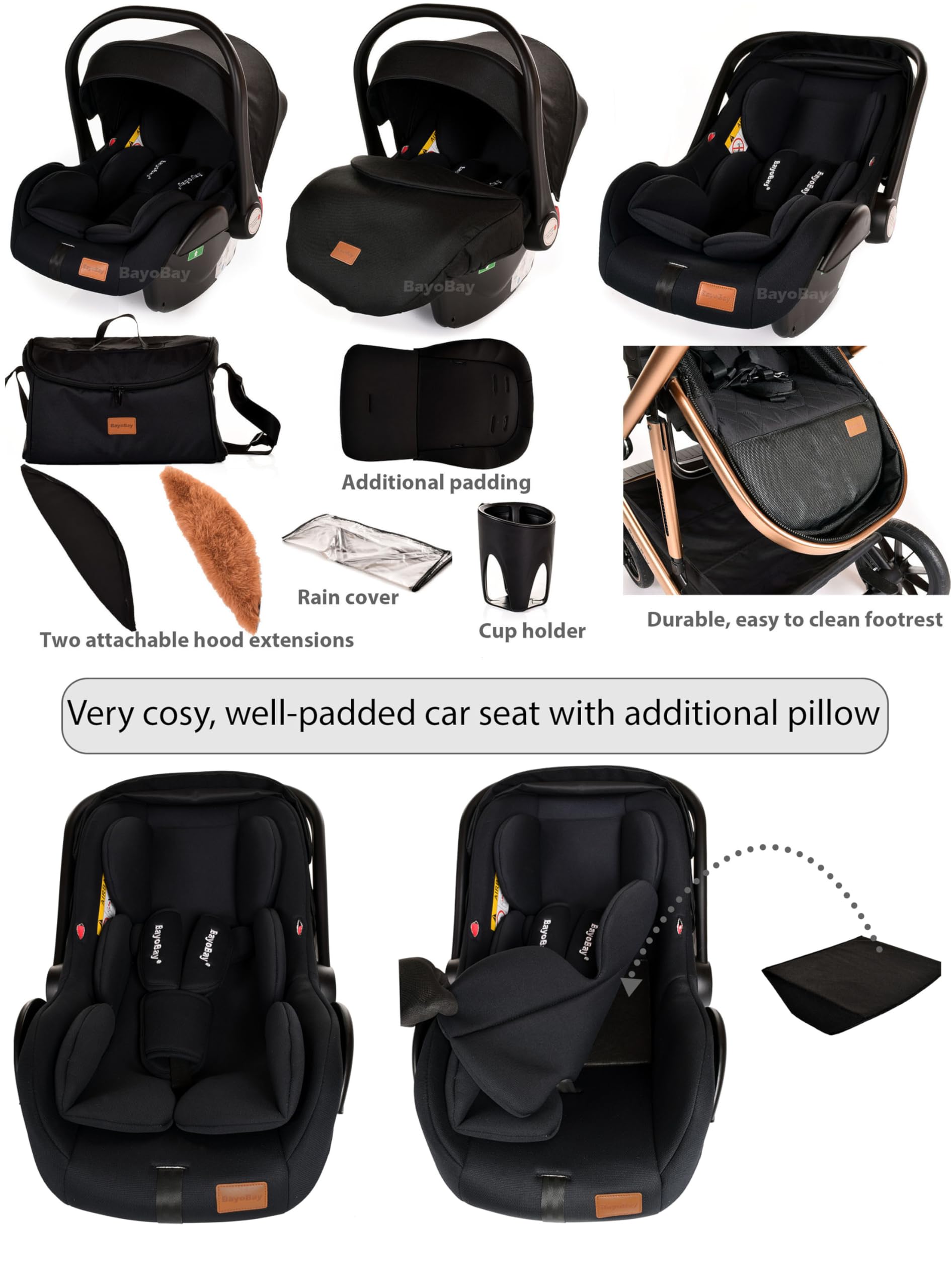 3 in 1 Travel System Baby Pram Buggy with Car Seat Pushchair Carriage Child Lightweight Folding Stroller for Newborns Toddlers from Birth up to 22kg New 2025 Style (BB1 - Black Gold, BB1)