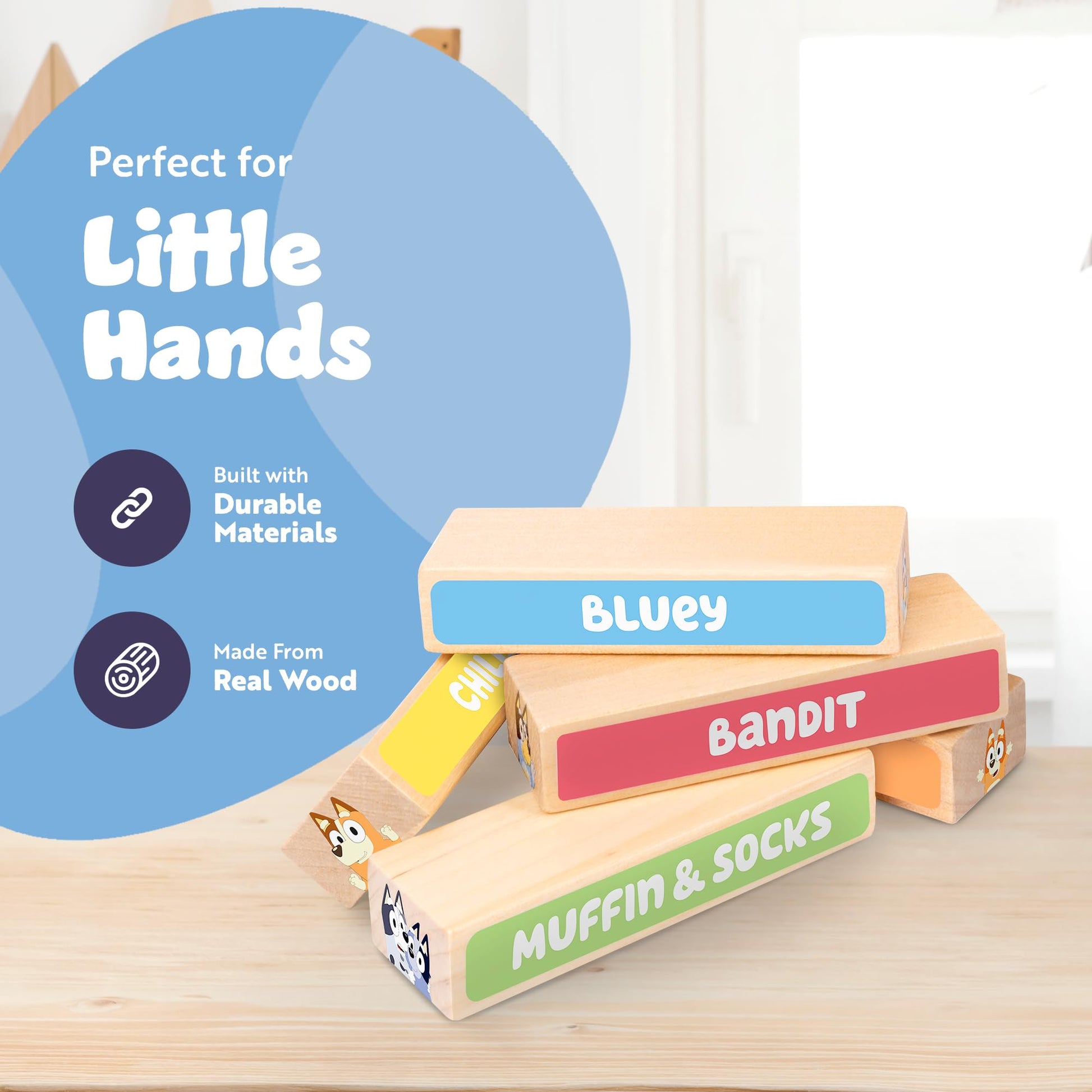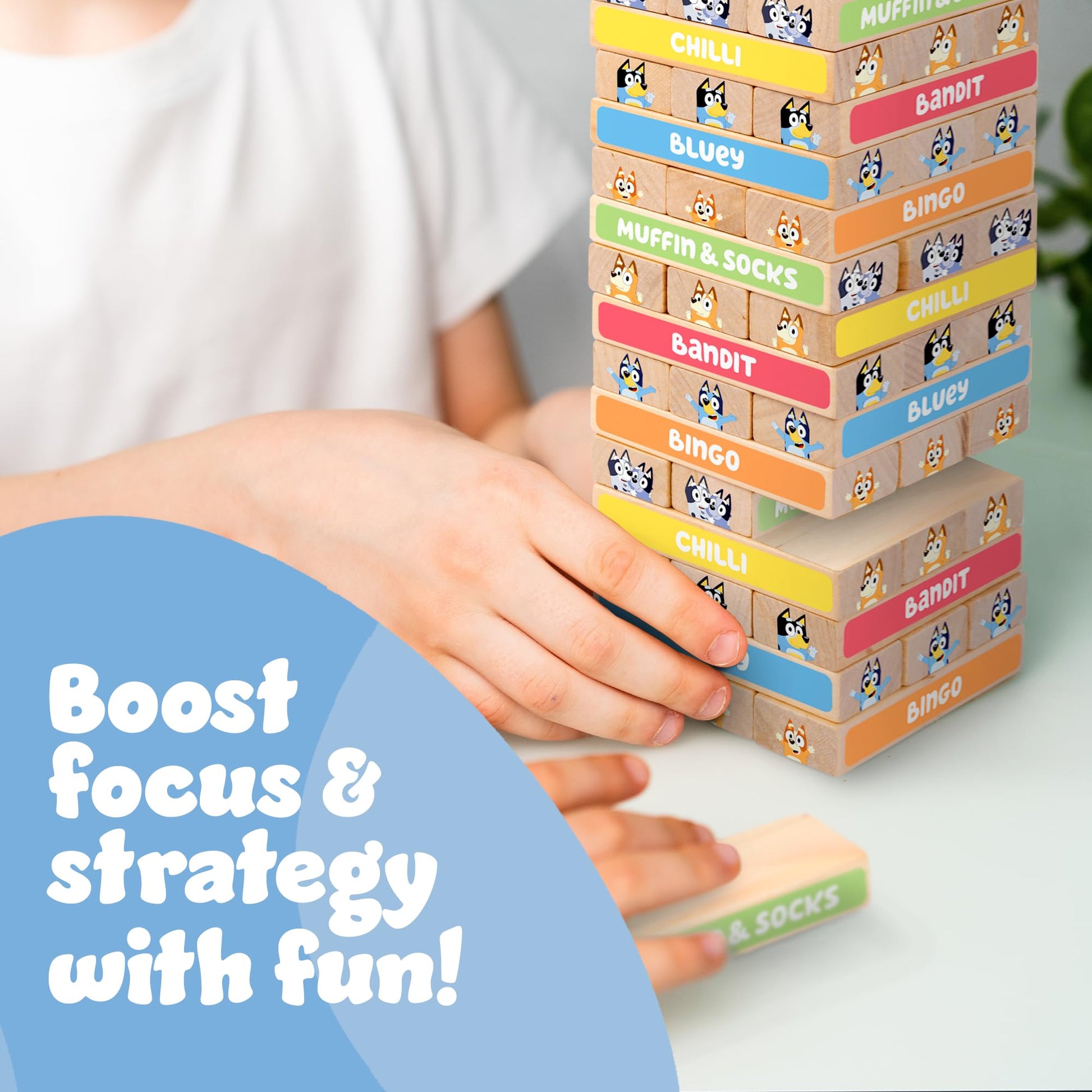 Bluey Tumbling Tower Game - 54 Colourful FSC-Certified Wooden Blocks, Hand-Eye Coordination & Motor Skills Family Game, Eco-Friendly Fun for Kids Aged 3+, Durable & Non-Toxic