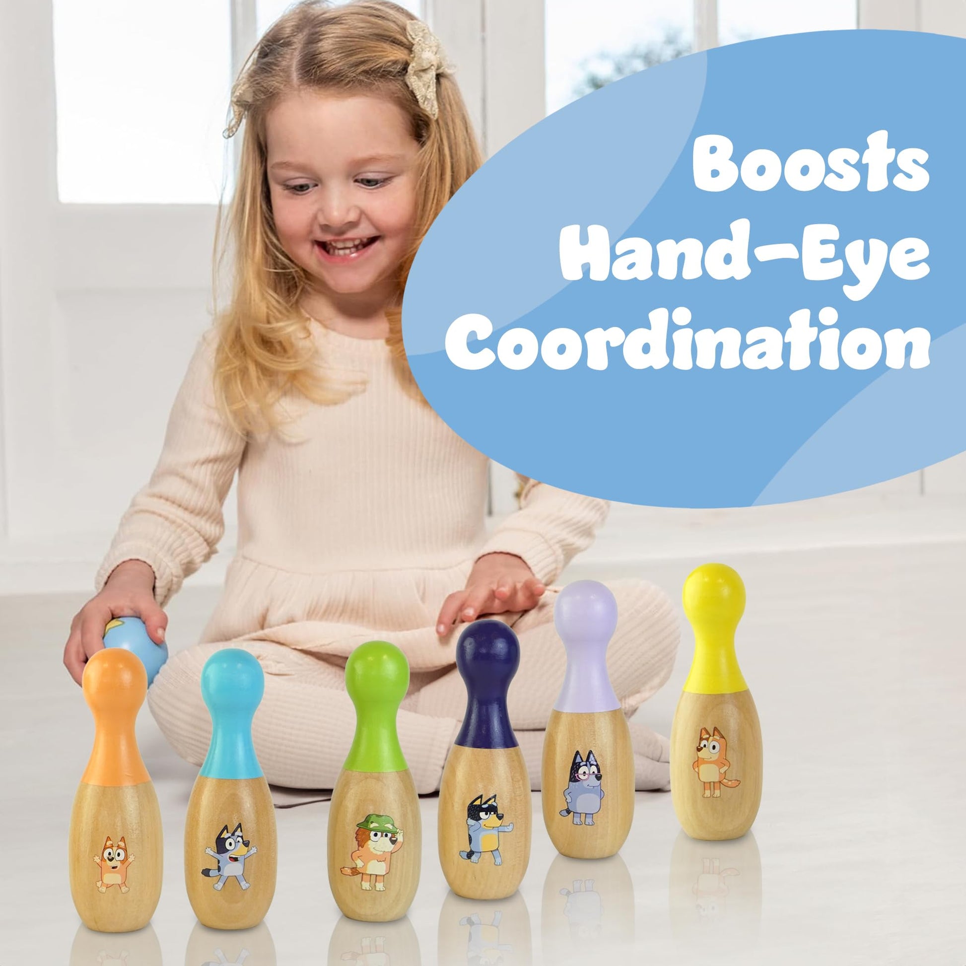 Bluey - Wooden Skittles Set - Indoor & Outdoor Bowling Game for Kids - 6 Character Pins & 1 Ball - Develops Motor Skills & Hand-Eye Coordination - FSC Certified, Ages 3+ (Classic)