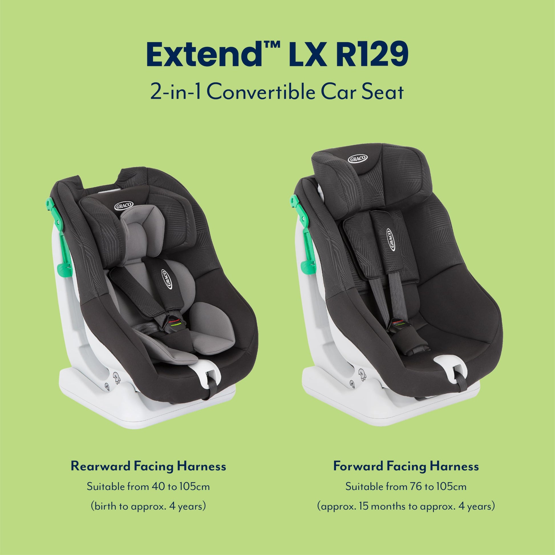 Details: The simple and safe way to go and grow. Graco's Extend™ LX R129 car seat is suitable from 40-105cm (birth to approx. 4 years) and can be used both forward and rearward facing. With the Graco Extend™ LX R129 car seat, children can sit rearward facing from birth all the way to approx. 4 years—because we know that’s the safest way to travel. With side impact protection, a padded newborn insert, and harness pads this is all you need and more for a comfortable ride every time.