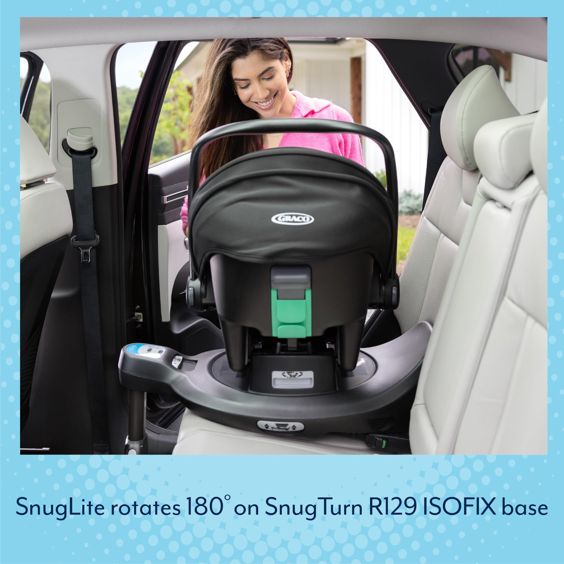 - Compatible with 2 bases: In a matter of seconds, connect the infant car seat to either of the compatible bases; the SnugTurn i-Size R129 rotating ISOFIX base, transforms this infant car seat into a rotating system, allowing you to easily turn the car seat towards the vehicle door for fuss-free ins and outs