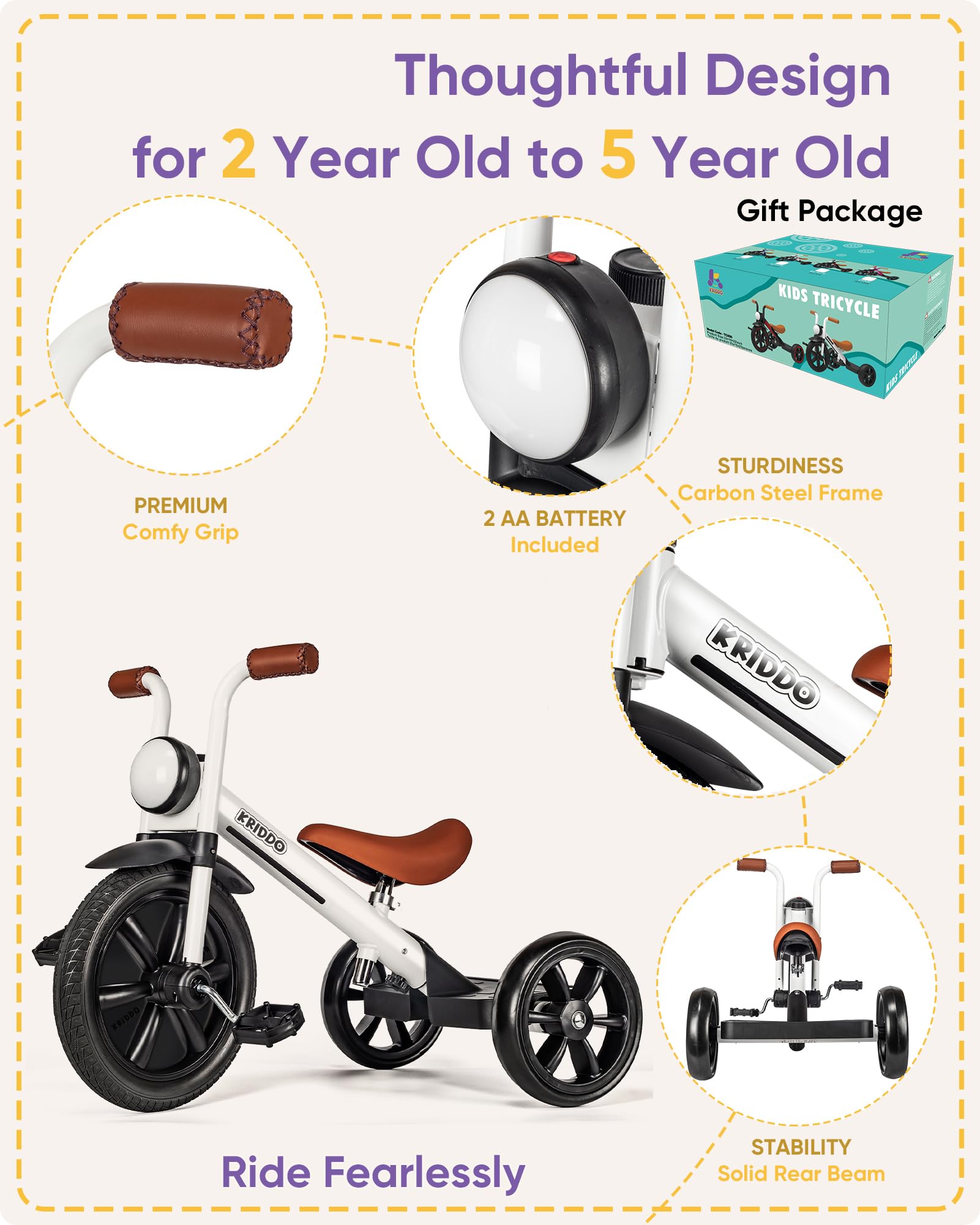 KRIDDO Kids Tricycles Age 2 Years to 5 Years, 12 Inch Puncture Free Rubber Wheel w Front Light, Adjustable Seat Height, Gift Toddler Tricycles for 2-5 Year Olds, Trikes for Toddlers, White