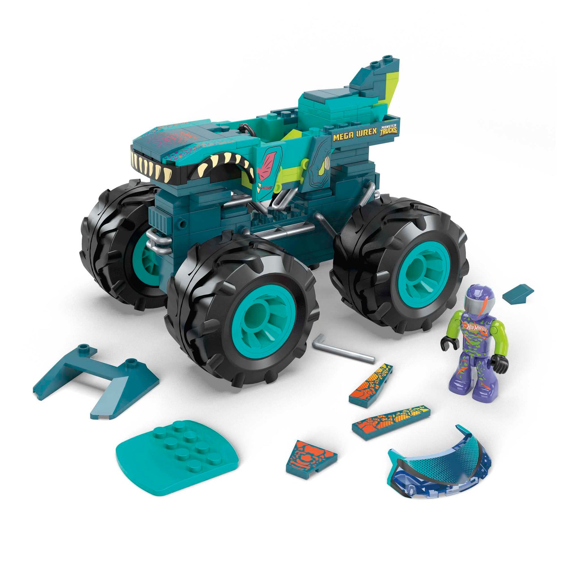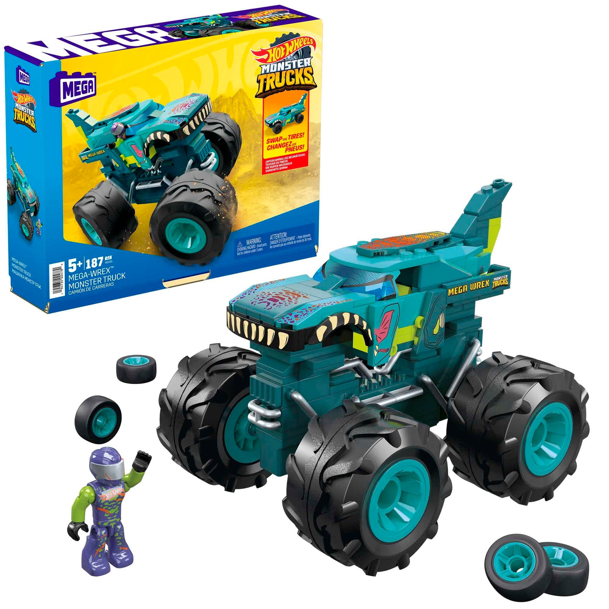 - 187-piece MEGA Hot Wheels Mega Wrex Monster Truck building toy with extra set of wheels that turns vehicle into a race car