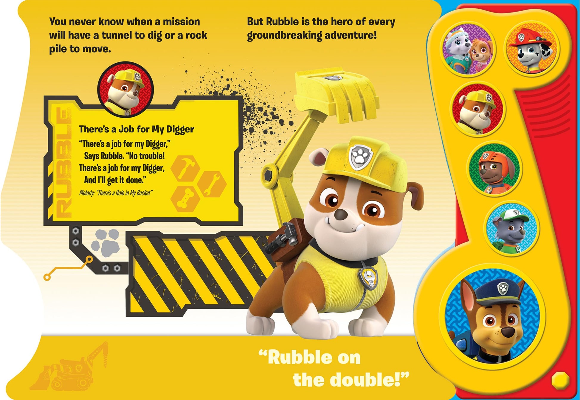 This song book is PAW-some because: Hands on interaction engages young reading comprehension Matching pictures to sound buttons builds concentrations Characters include Ryder, Chase, Skye, Marshall, Rubble, and more