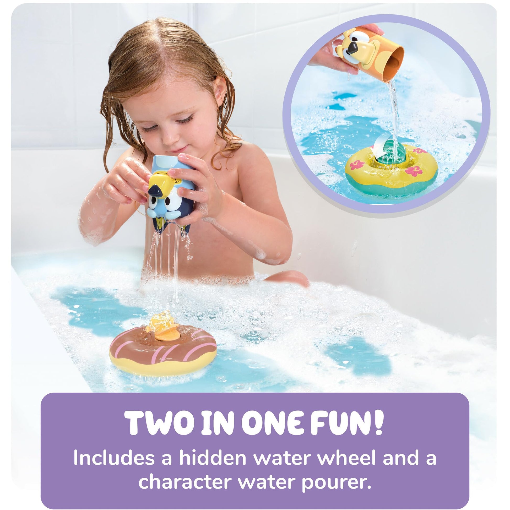 - BATH TIME BLUEY AND BINGO TOYS: Get little ones excited for bath time with this adorable Bluey bath toy float 2 pack - Bluey and Bingo cups bob around on colourful pool floats - take them off the floats to reveal water wheels ready for water spinning action!