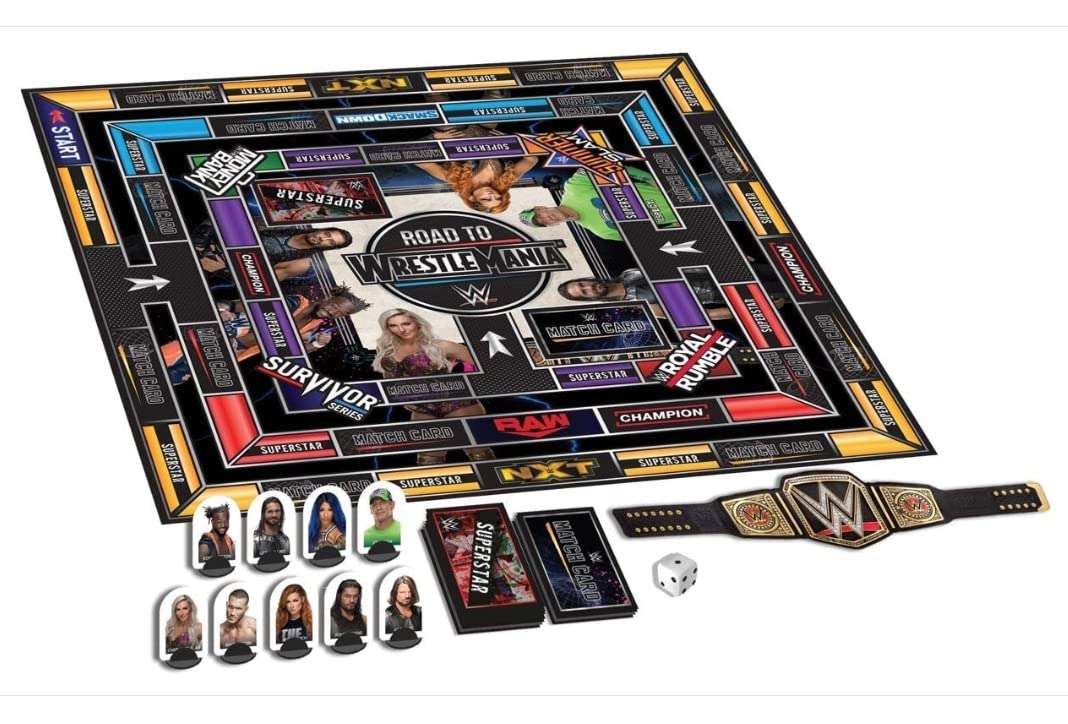 Details: It is WWE's biggest event of the year and everyone is trying to make it to the main event of WrestleMania! The only way you can get there is to rack up the victories across WWE’s biggest shows and make sure you have the best move set, so you can taste victory on the Grandest Stage of Them All. Win your way through NXT, Raw, SmackDown and a big pay-per-view, use your best moves to defeat your opponent and get your hands on the prestigious WWE Championship! Features and Specifications: Players: 2-4 Time to play: 30 - 60 minutes Suitable for Age 8 Product dimensions: 40 x 27 x 5cm Material: Card Board 95%, Plastic 5% Box Contents: 1 x Game Board 9 x Character Movers 30 x Match Cards 60 x Superstar Cards 1 x WWE Belt 1 x Dice 1 x Instructions Booklet Product Safety: Choking Hazard - Small Parts Not suitable for children under 3 years